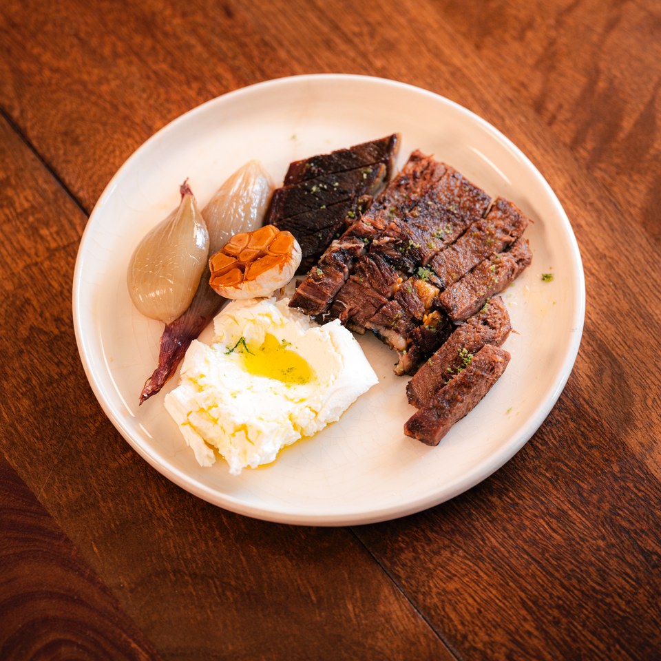 Disposer sur une assiette la langue snackée avec un peu de labneh (recette ici) arrosée d'EVOO Féroce et accompagnée de sauce tomate épaisse (recette ici) et d'échalotes confit.