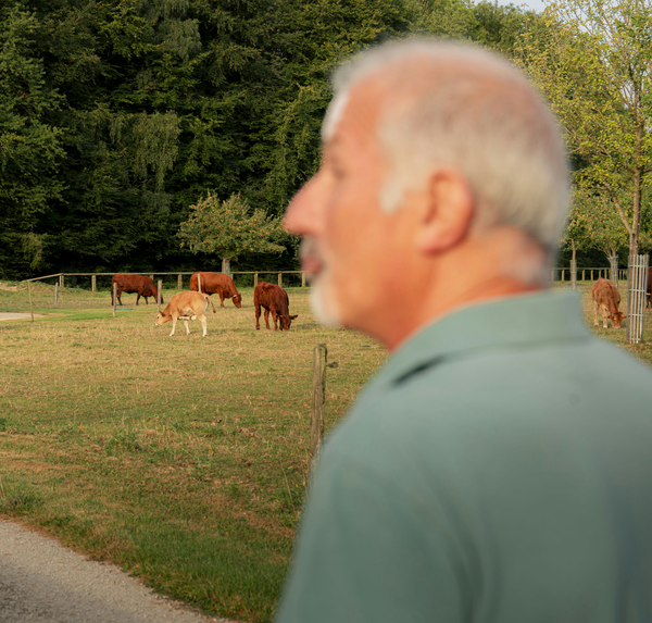On a choisi d'élever des Salers : c'est une vache de fainéant car elle est rustique et il n'y a pas trop besoin de s'en occuper lorsqu'elle vit naturellement en pâturage.